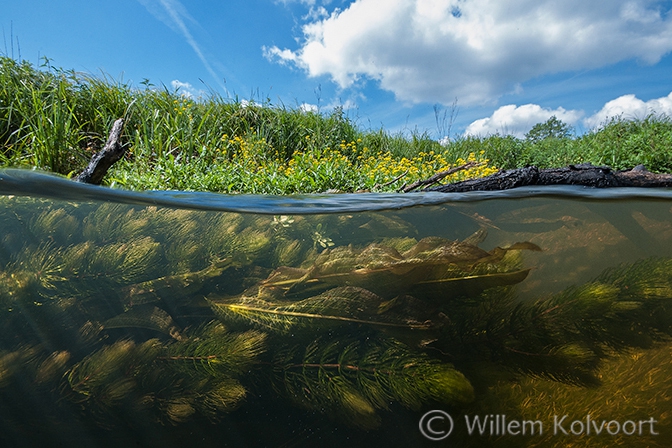 Gedoornd hoornblad en glanzig fonteinkruid op in het water gelegde takken.