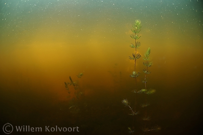 In het oranje water van een petgat groeit een eenzaam plantje gedoornd hoornblad.